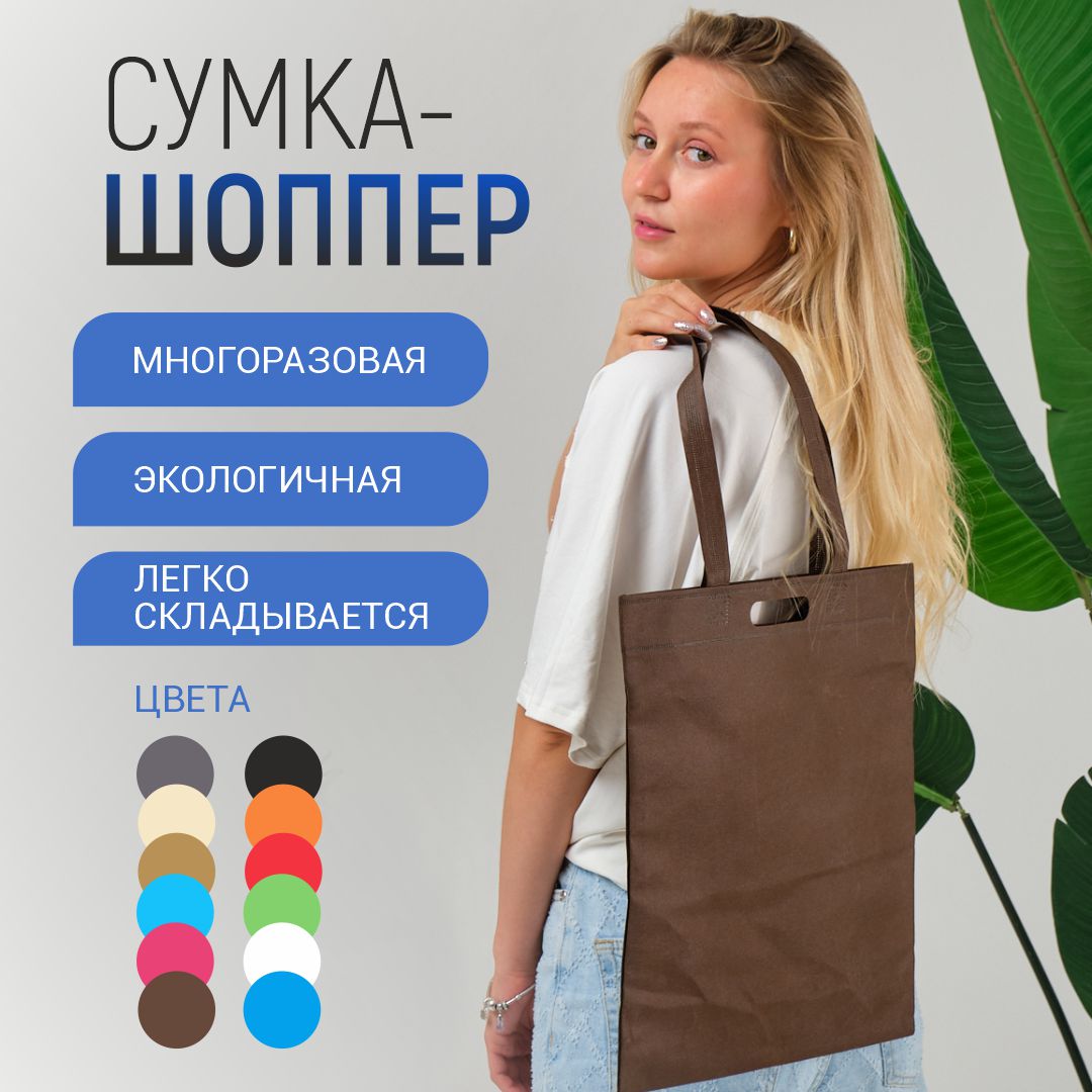Многоразовый шоппер из нетканого материала с надежными пришивными ручками. Сумка из спанбонда приятная на ощупь, легкая и компактная.