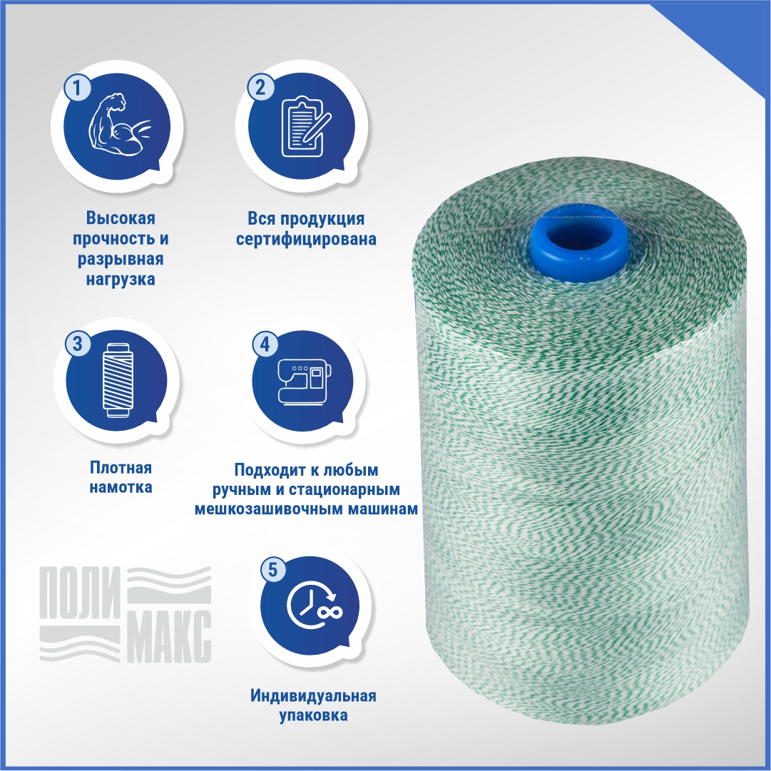 В компании «Полимакс» представлены бело-зеленые мешкозашивочные нити из 100% полиэстера с силиконовой пропиткой. Ими фиксируют горловины мешков для защиты содержимого от влаги, мусора, просыпания во время транспортировки.