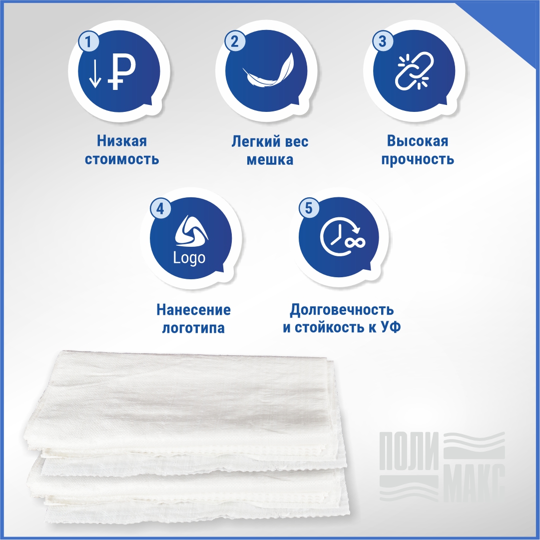Компания «Полимакс» предлагает белые мешки из первичного полиэтилена размером 55×95 см и вместимостью до 50 кг. Плотное плетение обеспечит сохранность содержимого. Ткань воздухопроницаема, поэтому пищевая продукция сохраняет свое качество. Посторонний запах отсутствует.